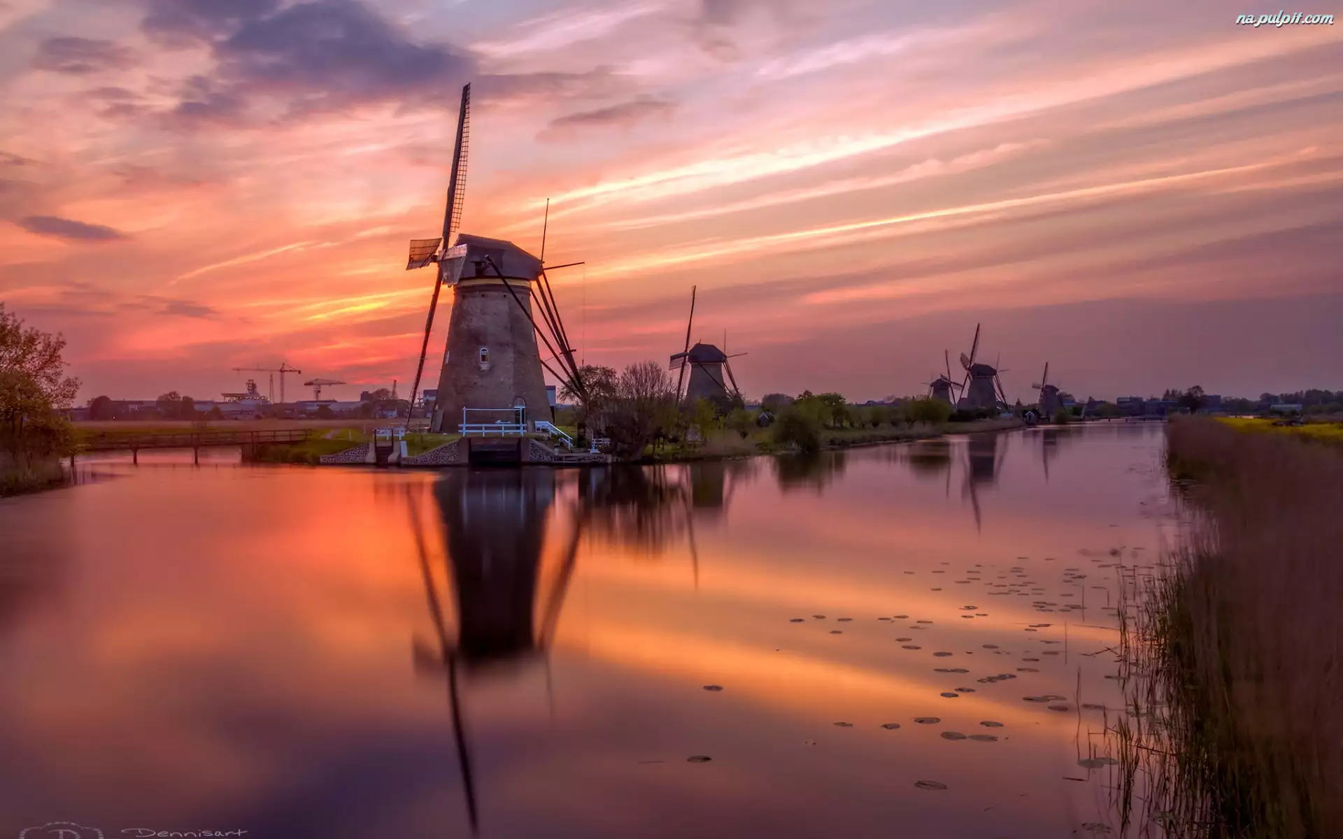 Holandia, Rzeka, Zachód słońca, Wiatraki