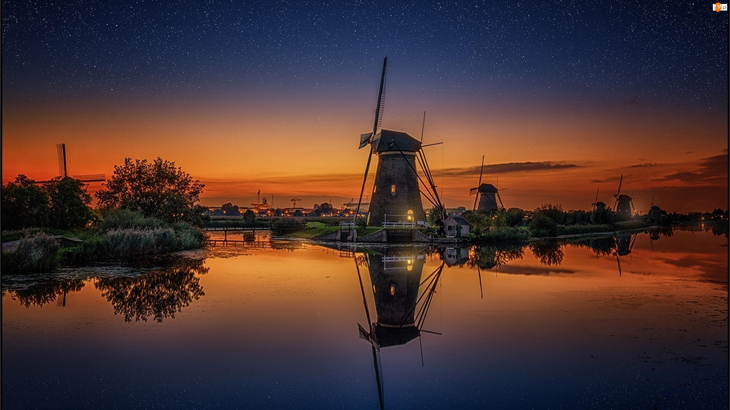 Wiatraki, Słońca, Rzeka, Zachód