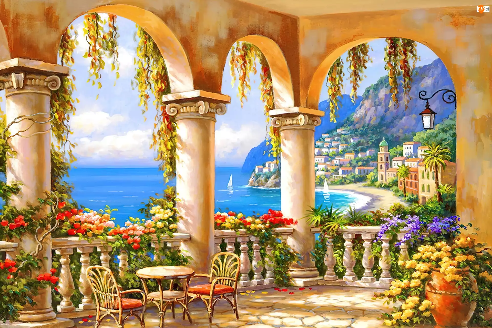 Widok, Krzesła, Domy, Taras, Morze, Stolik, Kwiat
