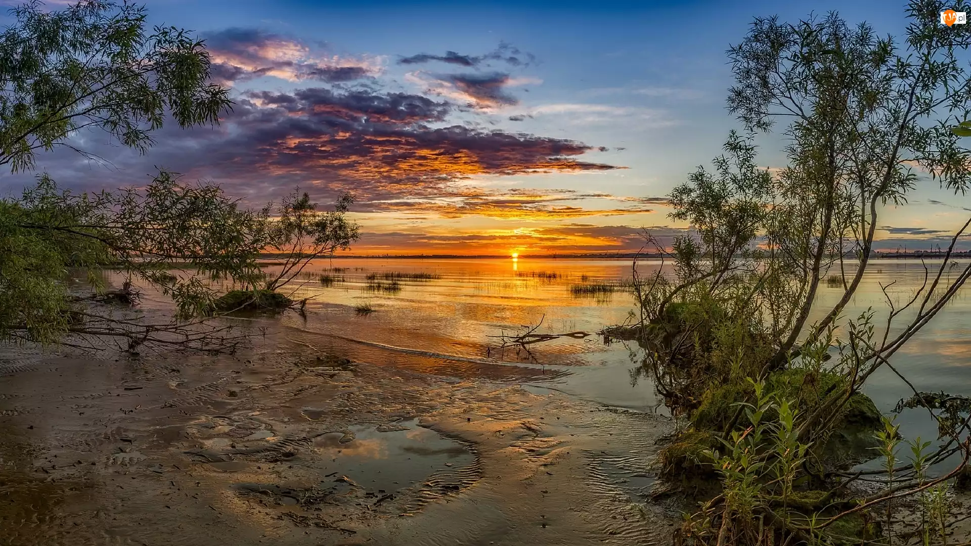 Jezioro, Krzew, Zachód słońca, Drzewa
