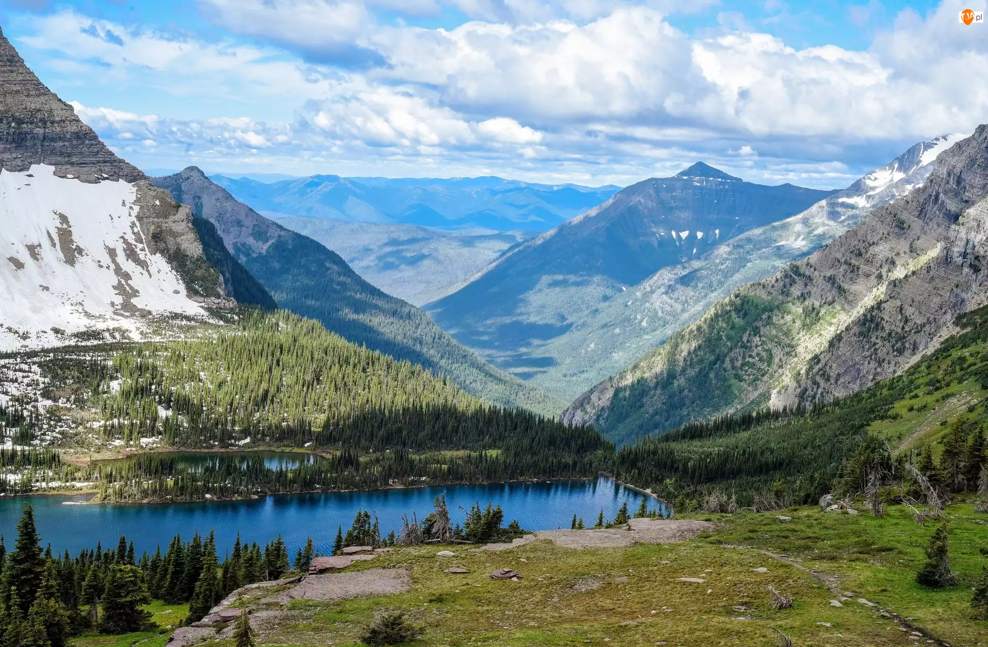 Stan Montana, Park Narodowy Glacier, Chmury, Stany Zjednoczone, Drzewa, Jezioro Hidden Lake, Góry