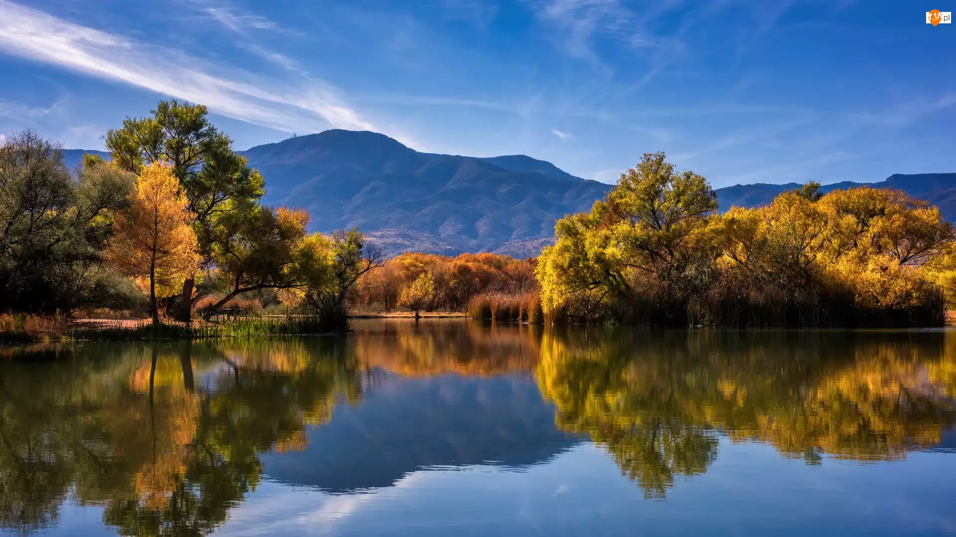Jesień, Stany Zjednoczone, Góry, Drzewa, Utah, Jezioro, Odbicie, Park stanowy Dead Horse