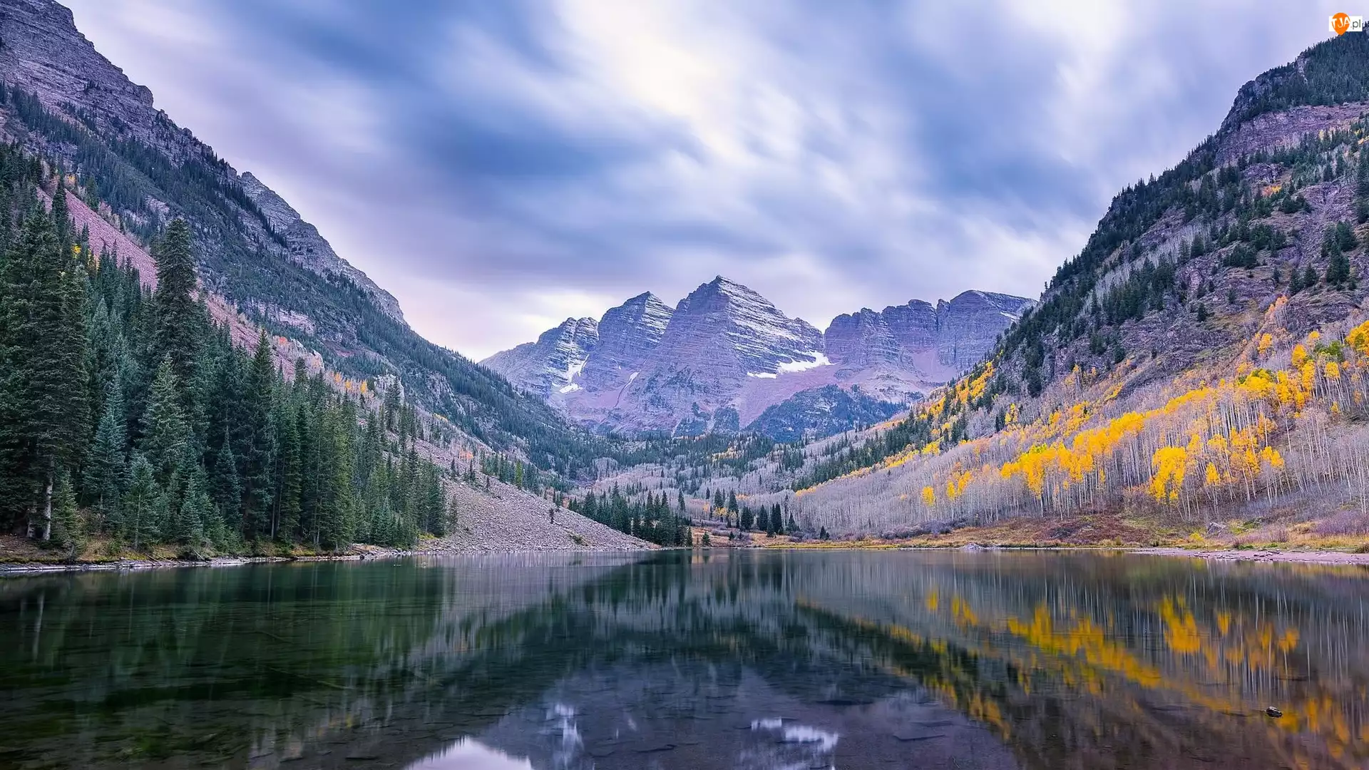 Stan Kolorado, Stany Zjednoczone, Szczyty Maroon Bells, Drzewa, Góry, Jezioro Maroon