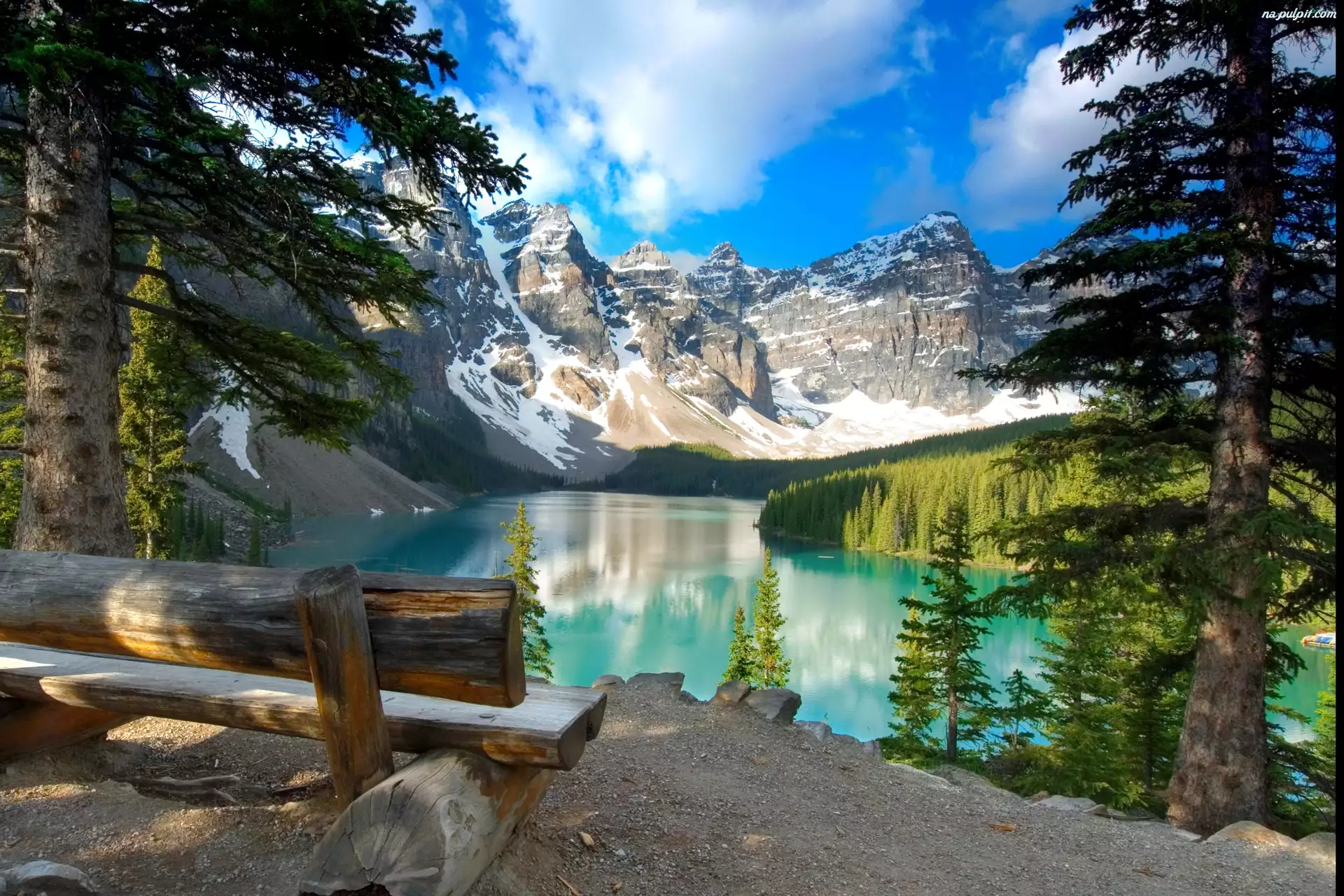 Góry, Ławka, Kanada, Drzewa, Park Narodowy Banff, Jezioro Moraine