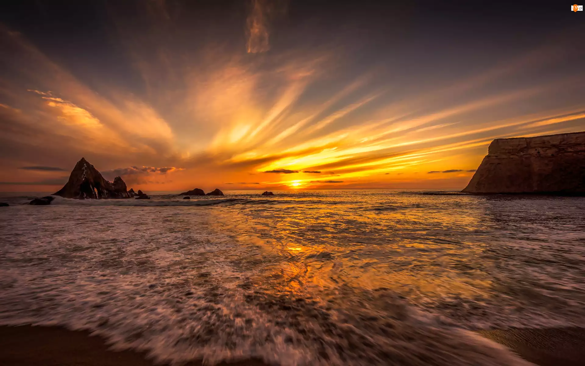 Morze, Blask, Skały, Zachód słońca