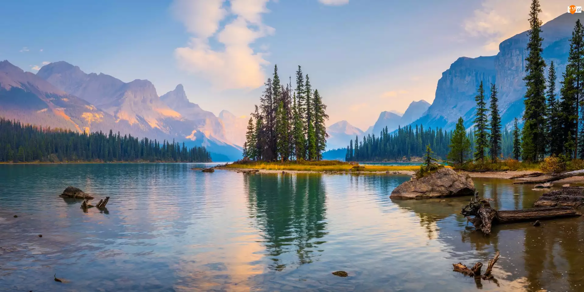 Chmury, Park Narodowy Jasper, Wyspa Ducha, Odbicie, Góry, Drzewa, Kanada, Jezioro Maligne