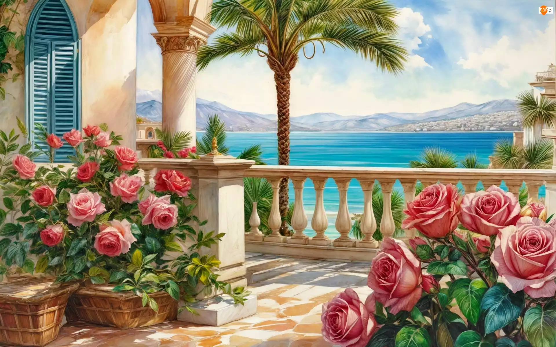 Morze, Balkon, Dom, Grafika, Róże, Kwiaty, Palma
