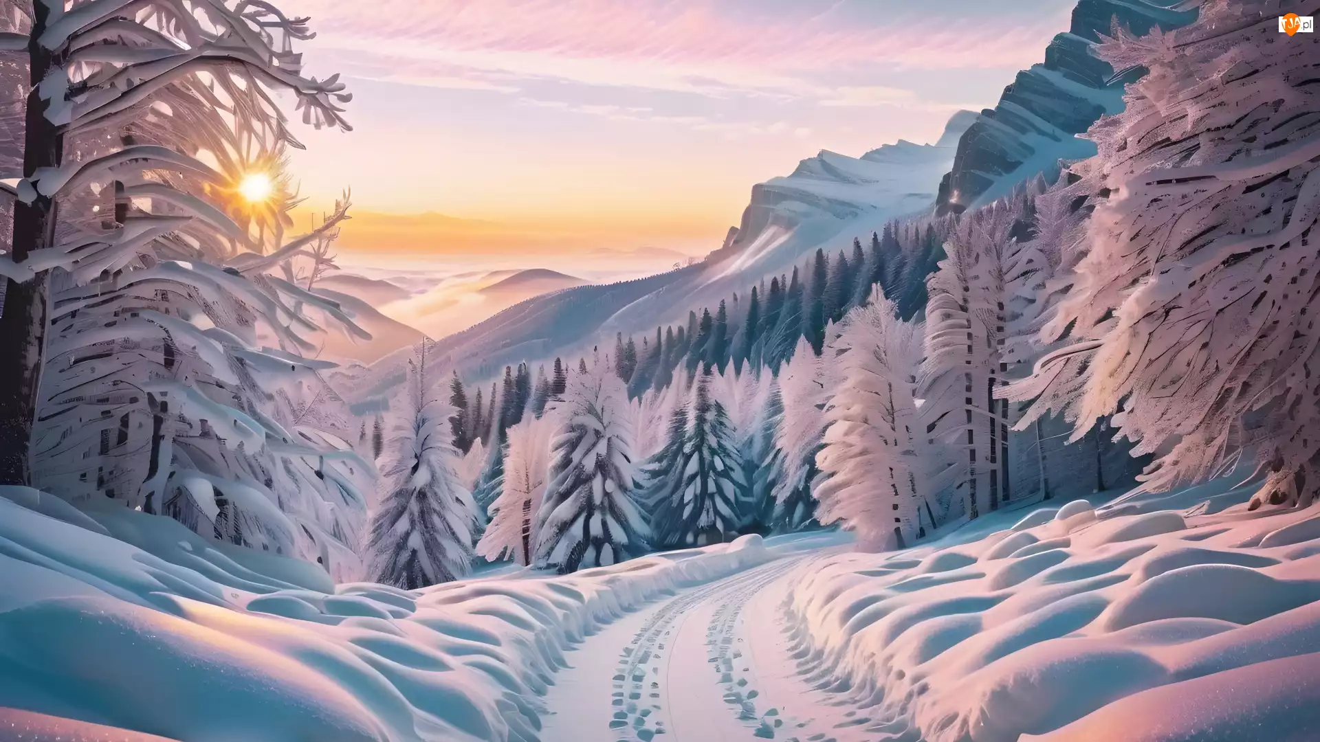 Drzewa, Zachód słońca, Droga, Zima, Góry