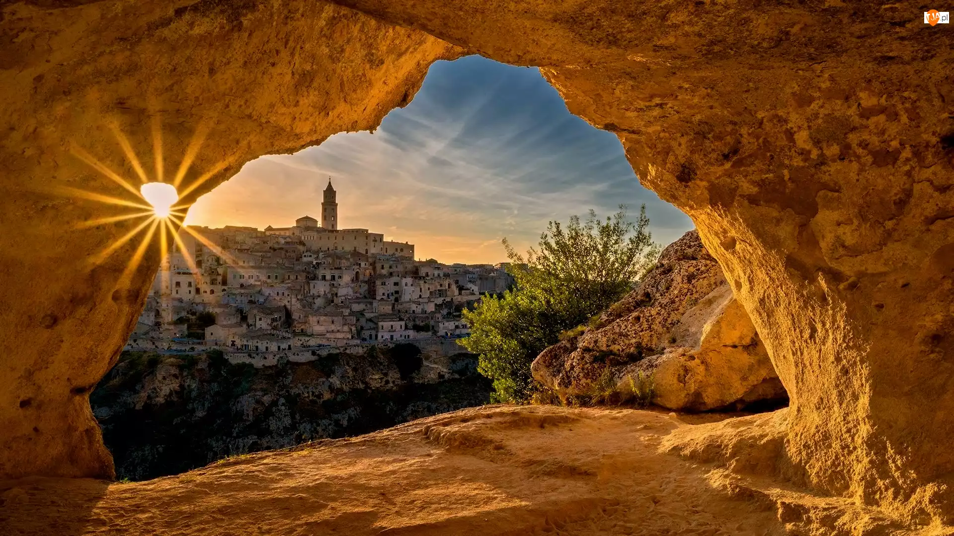 Domy, Włochy, Promienie słońca, Kościół, Matera, Miasto, Krzew, Skała