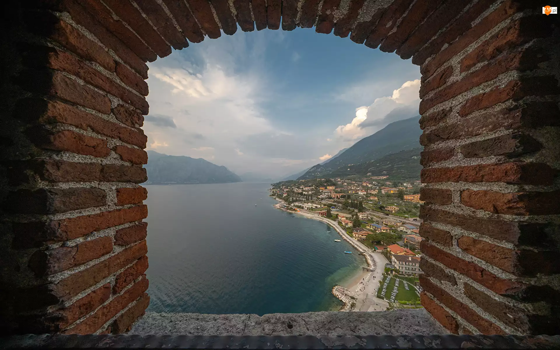 Mur, Jezioro, Okno, Niebo, Chmury, Lago di Garda, Veneto, Włochy, Widok