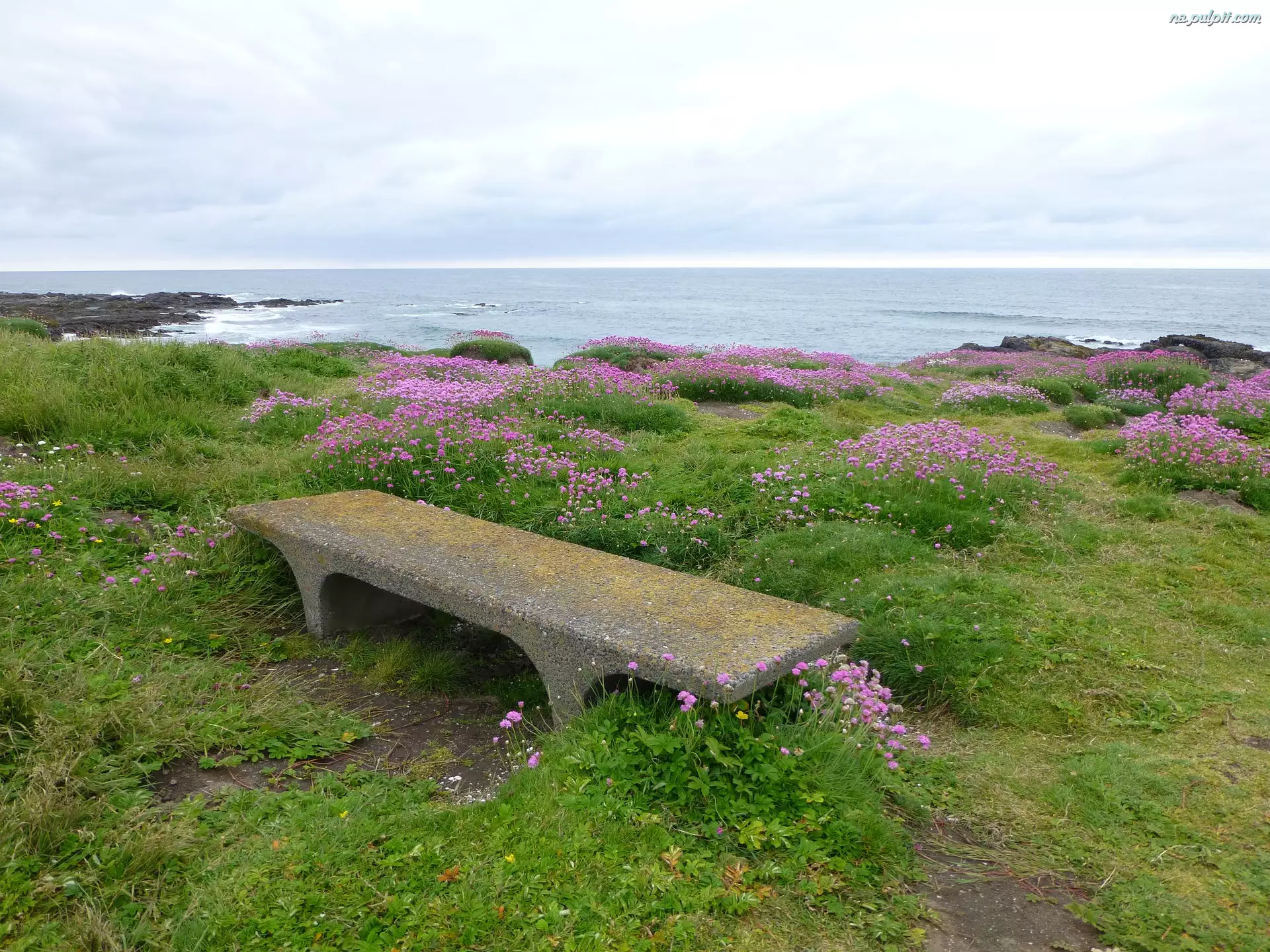 Wybrzeże, Morze, Kwiaty, Łąka, Ławka, Trawa