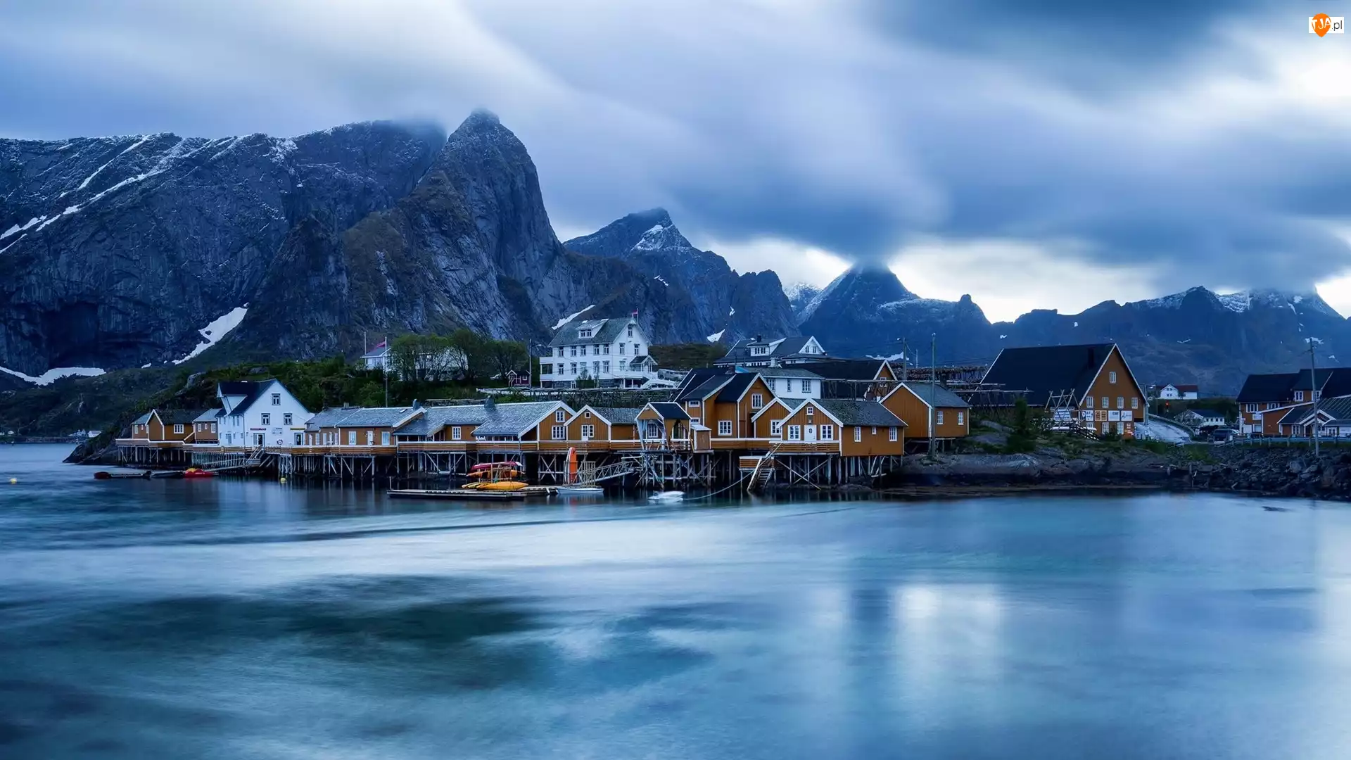 Lofoty, Góry, Chmury, Norwegia, Skały, Domy, Morze