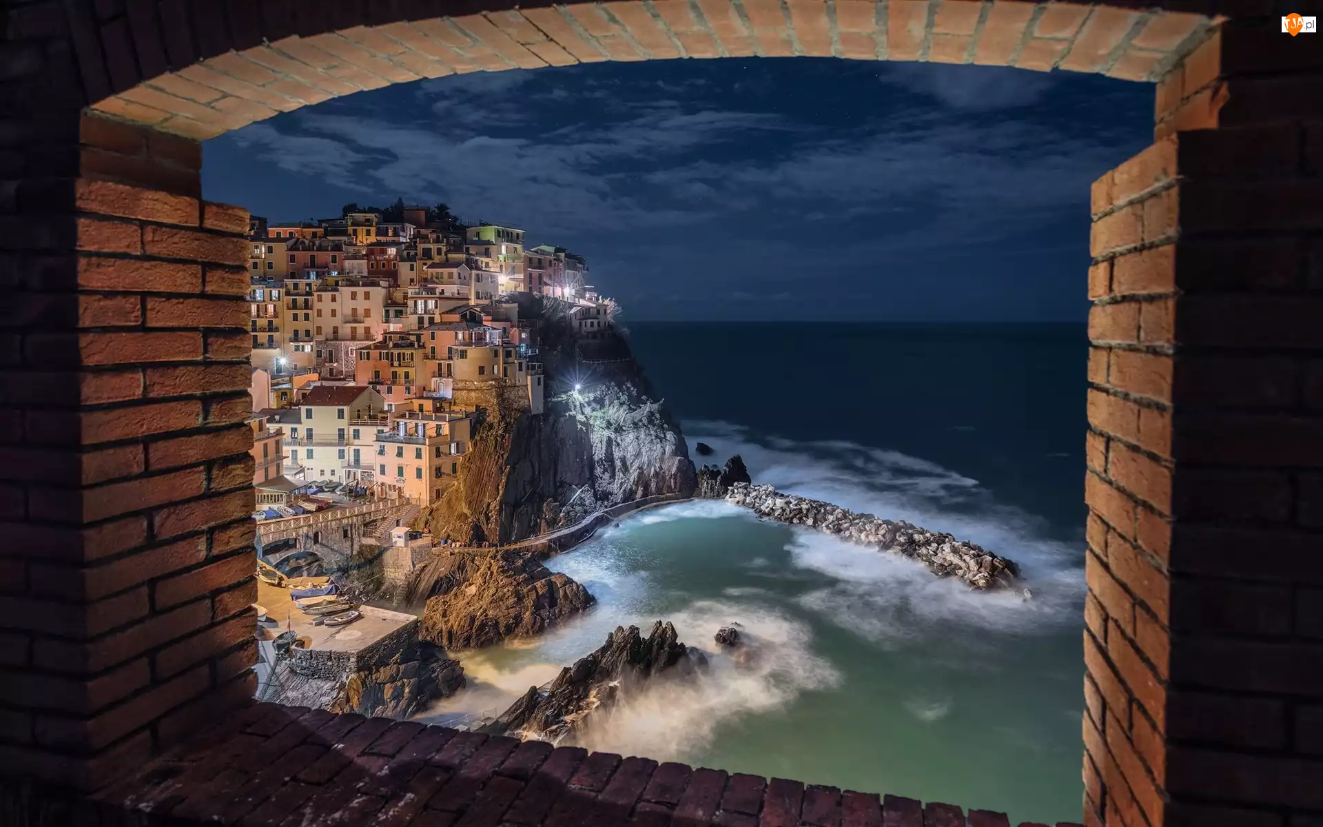 Noc, Morze, Manarola, Włochy, Okno, Domy
