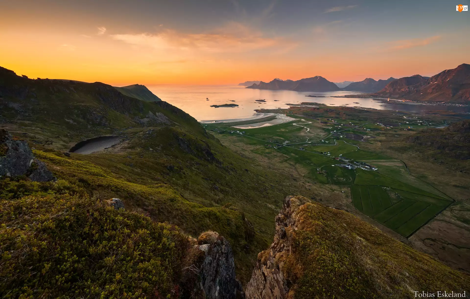 Lofoty, Góry, Wschód słońca, Norwegia, Morze Norweskie, Dolina, Roślinność