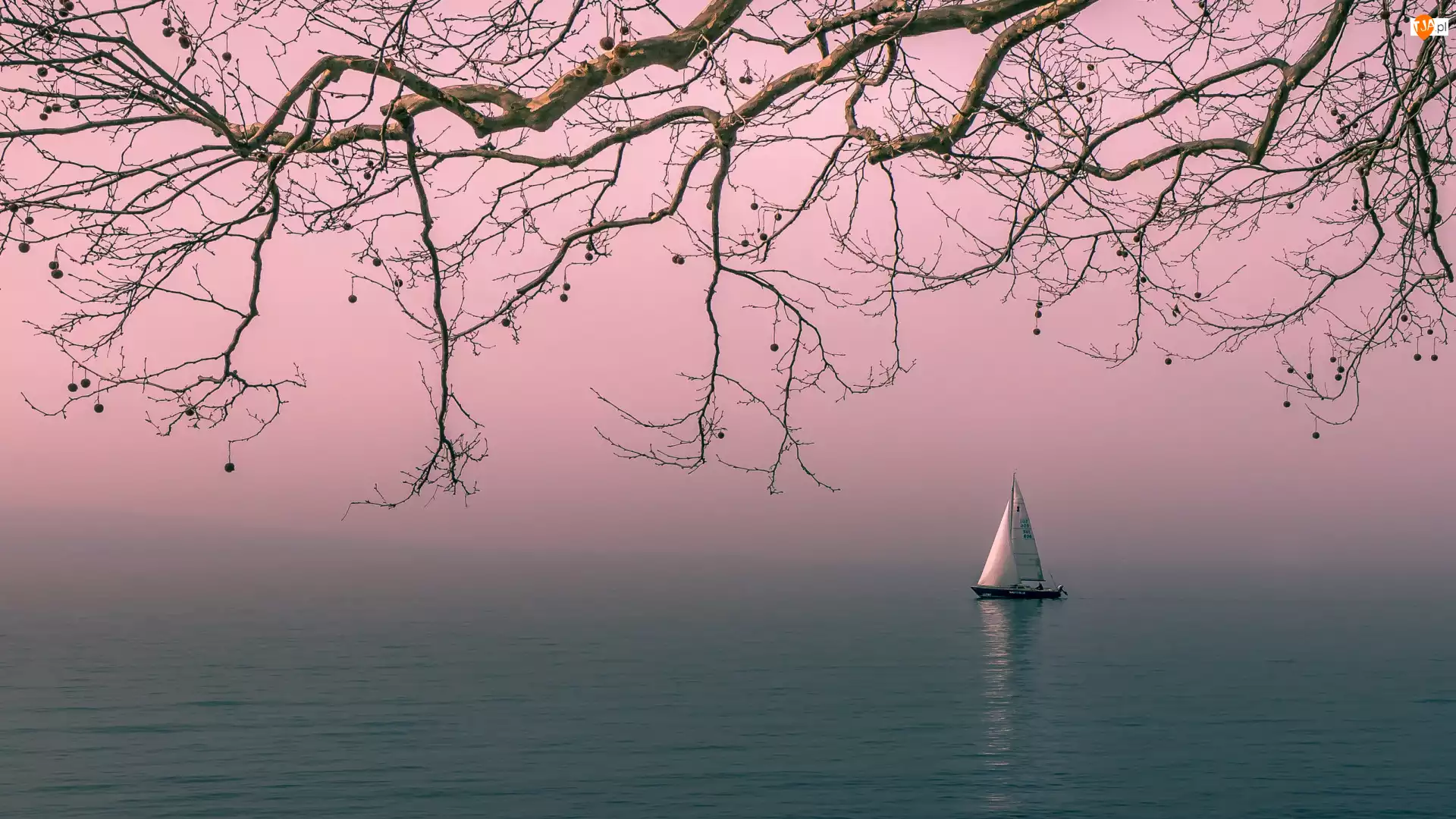Jezioro, Żaglówka, Poranek, Drzewo, Mgła, Gałęzie