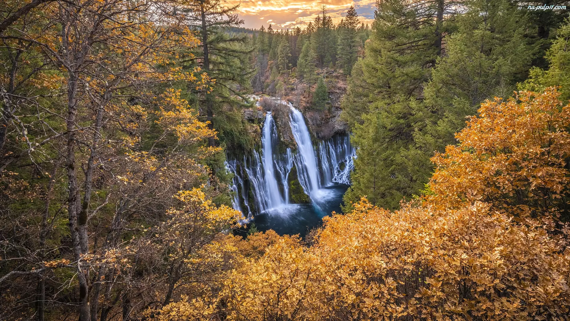 Burney Falls, Jesień, Stany Zjednoczone, Wodospad, Kalifornia, Drzewa, Park Stanowy McArthur Burney Falls