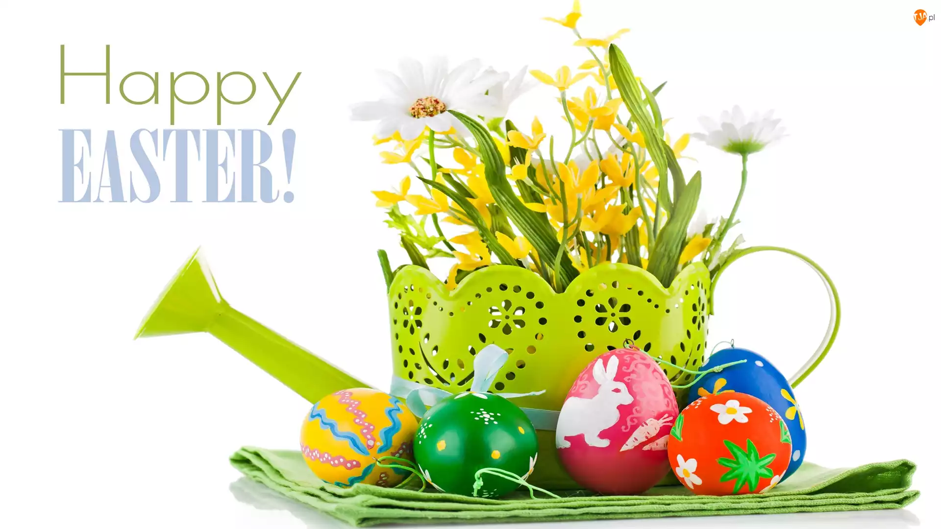 Pisanki, Wielkanoc, Kwiaty, Happy Easter, Konewka, Napis