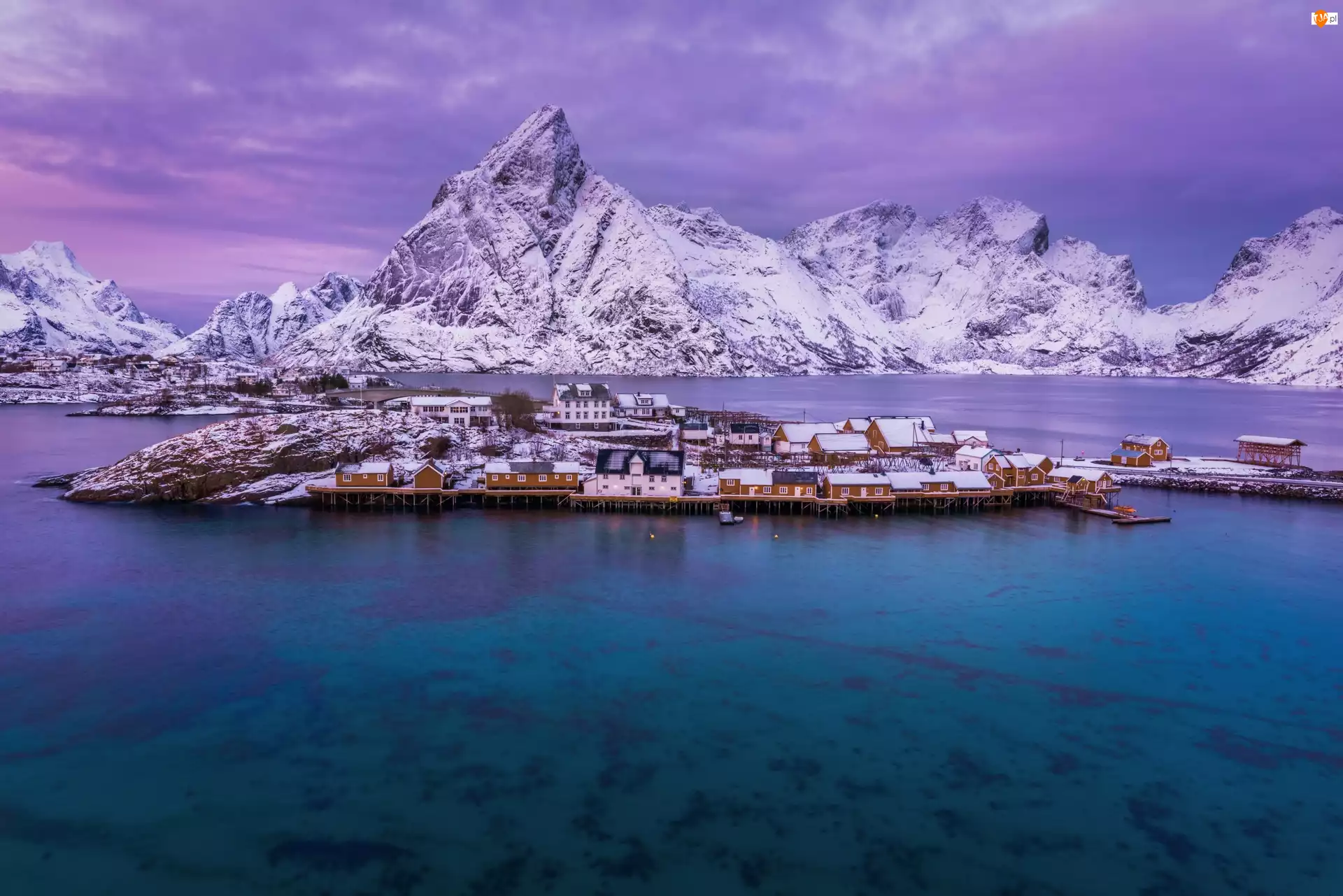 Zima, Wioska Reine, Lofoty, Domy, Góry, Norwegia