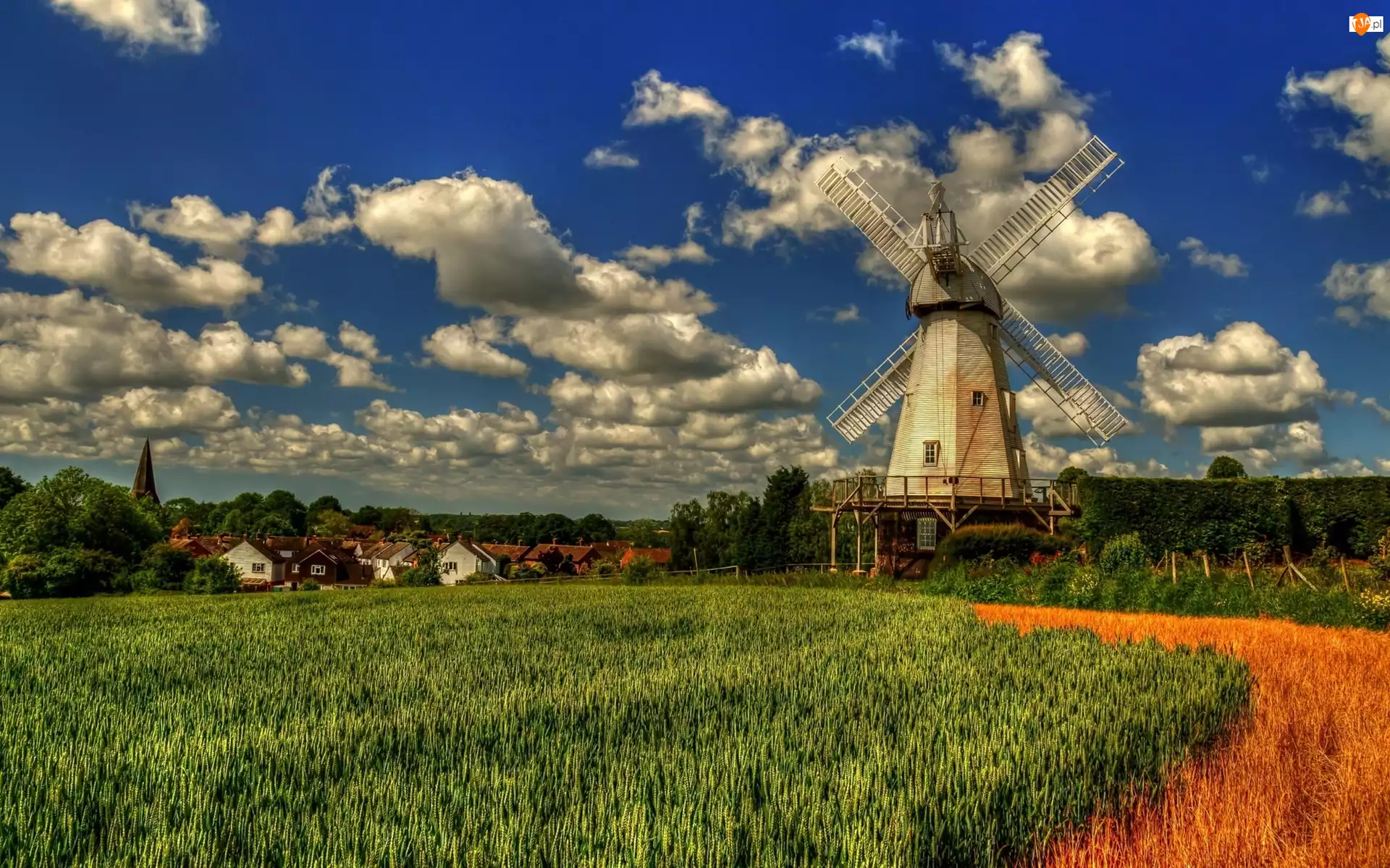 Wieś, Wiatrak, Niebo, Pole, Obłoki