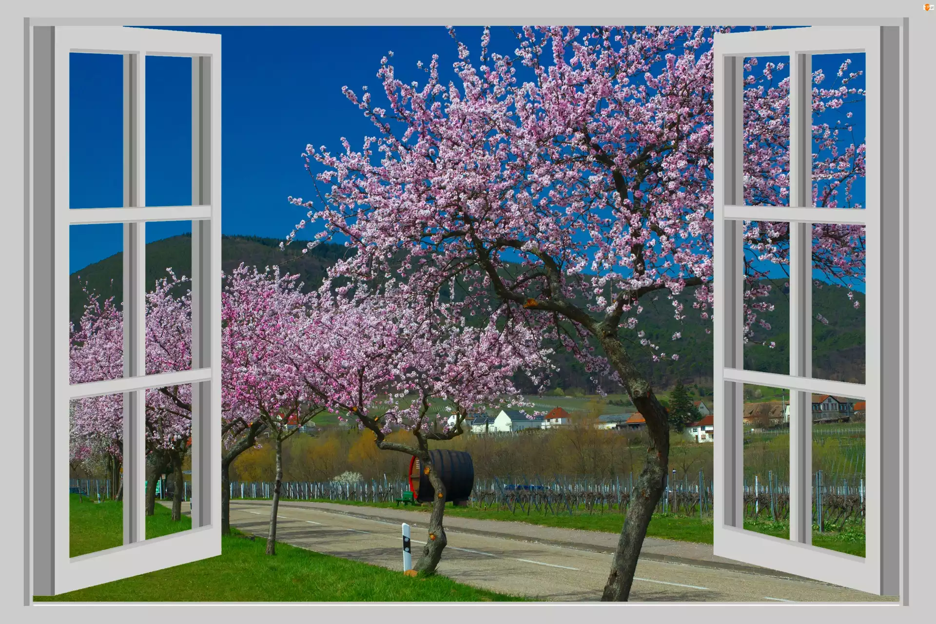 Wieś, Wiosna, Droga, Okno, Drzewa