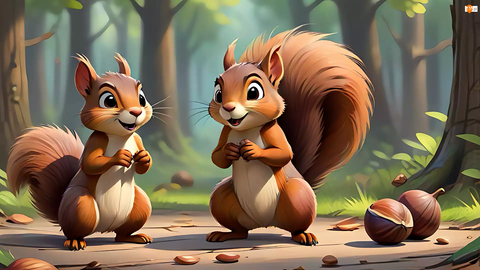 Wiewiórki, Las, Dwie, Grafika, Orzechy