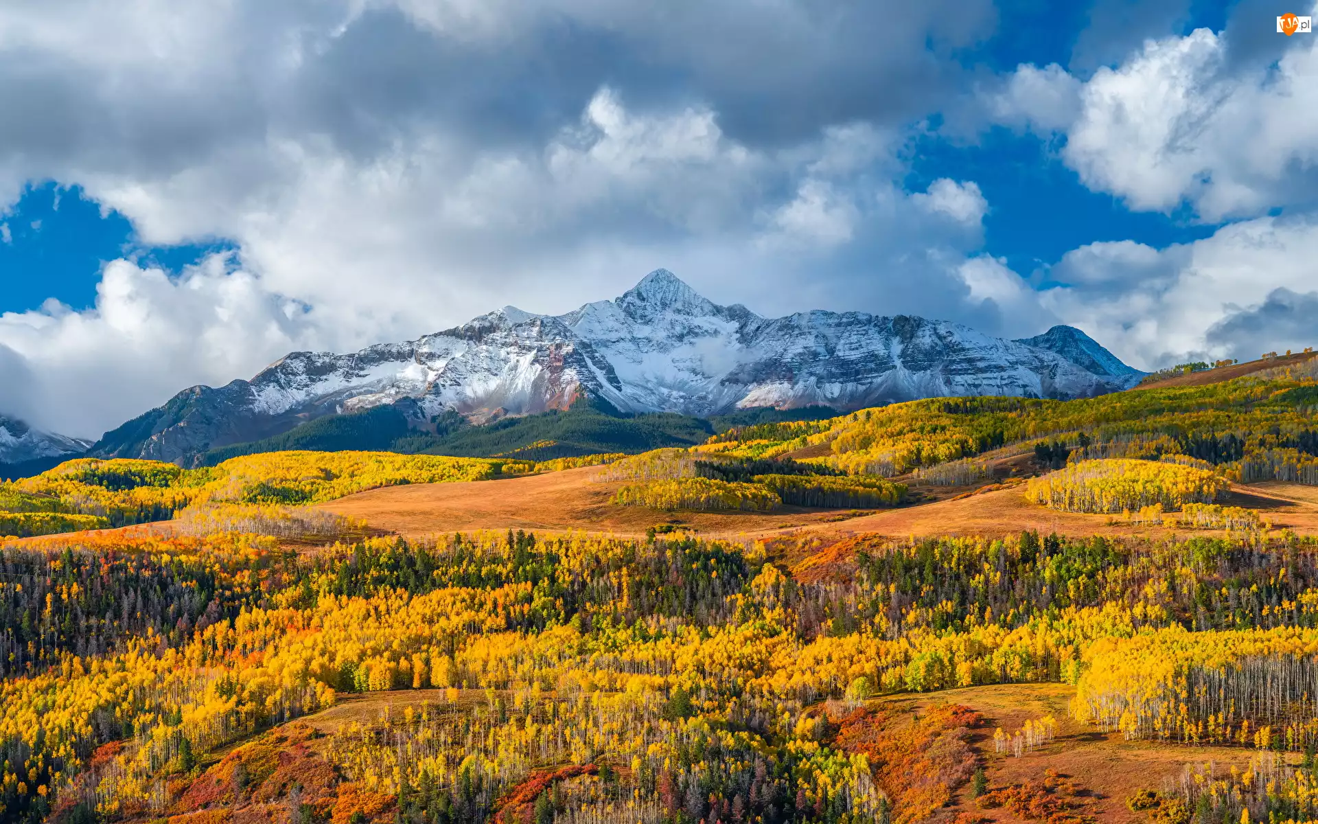 Wilson Peak, Lasy, Chmury, Pożółkłe, Góry, Kolorado, Wzgórze, Jesień, Drzewa, Góra, Stany Zjednoczone