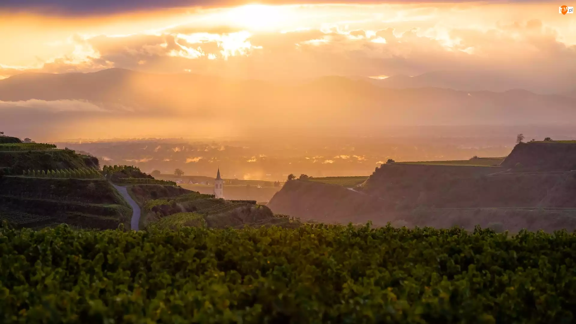 Miasteczko, Domy, Wschód słońca, Plantacja, Kaiserstuhl, Badenia-Wirtembergia, Vogtsburg, Góry, Winnice, Wzgórza, Niemcy