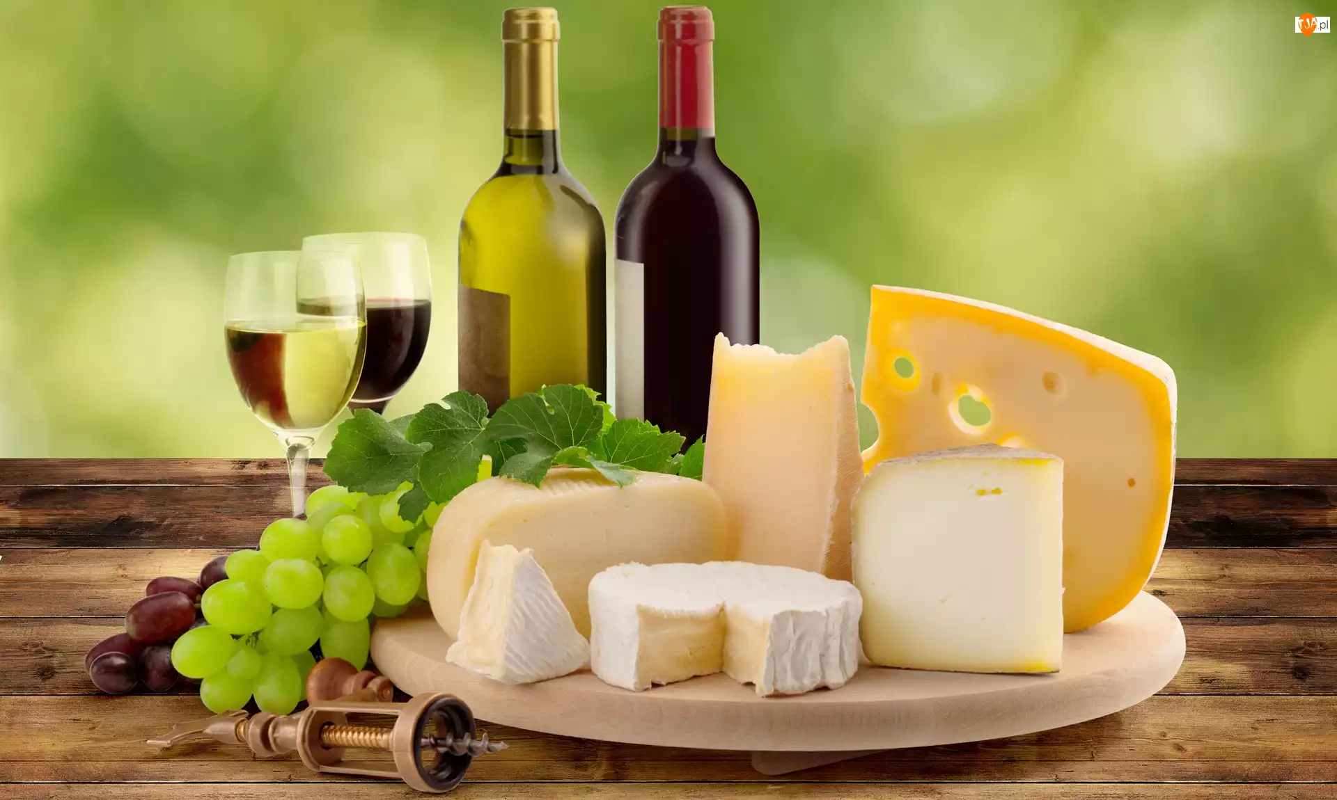 Wino, Kieliszki, Kompozycja, Butelki, Winogrona, Sery, Deska