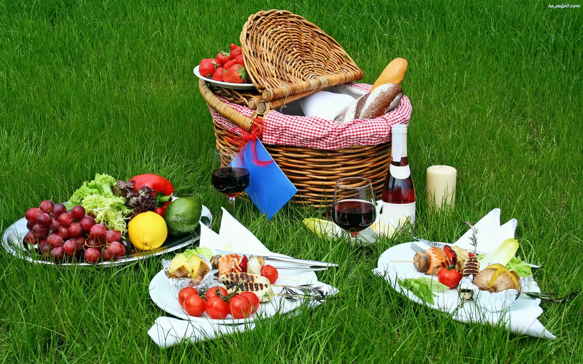 Wino, Owoce, Koszyk, Piknik, Łąka, Warzywa