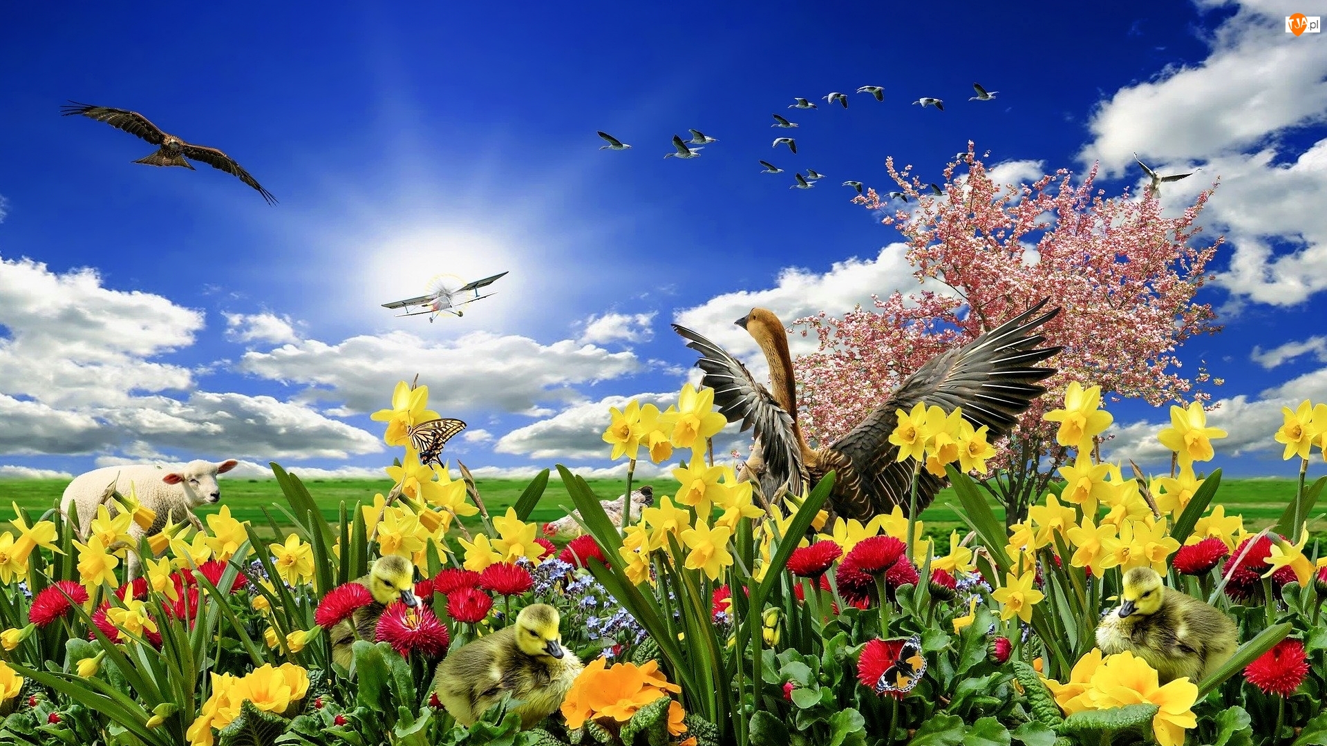 2D, Kolorowe, Wiosna, Ptaki, Owca, Kwiaty, Narcyzy, Łąka, Samolot