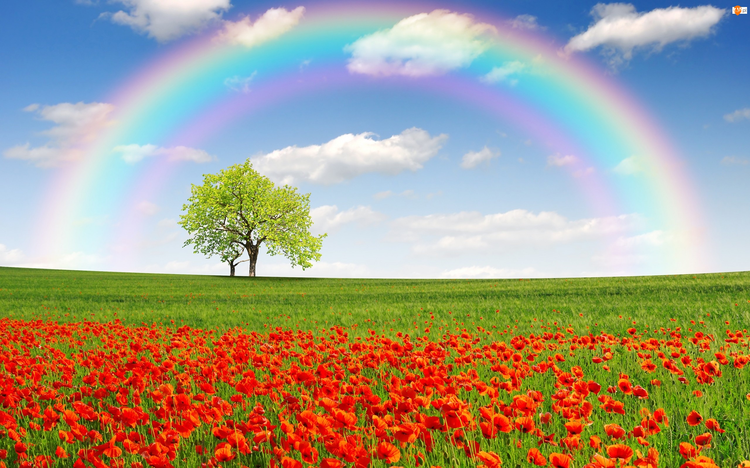 Drzewo, Wiosna, Maki, Łąka, Tęcza