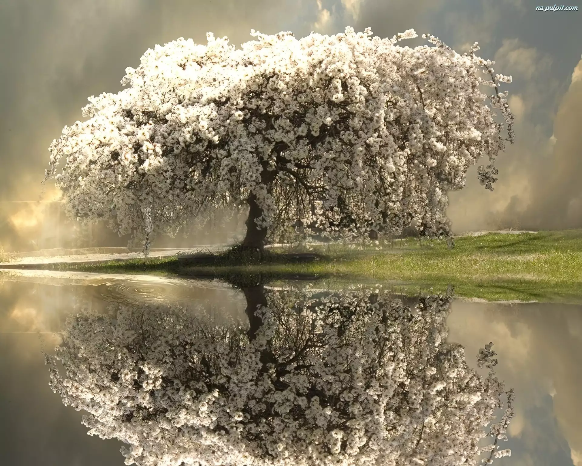 Odbicie, Wiosna, Kwitnące, Drzewo