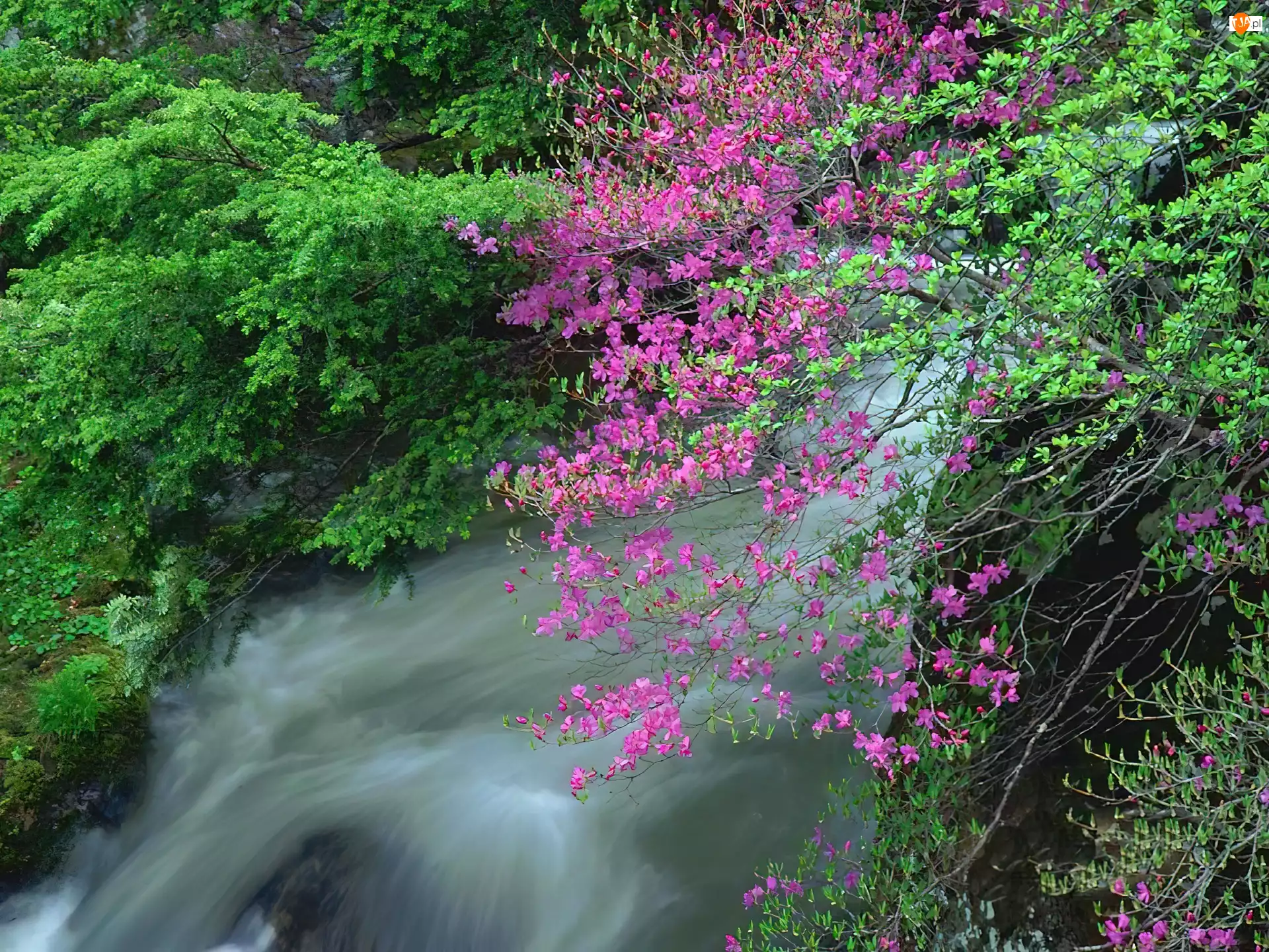 Wiosna, Rzeka, Kwitnące, Krzaczki, Zieleń