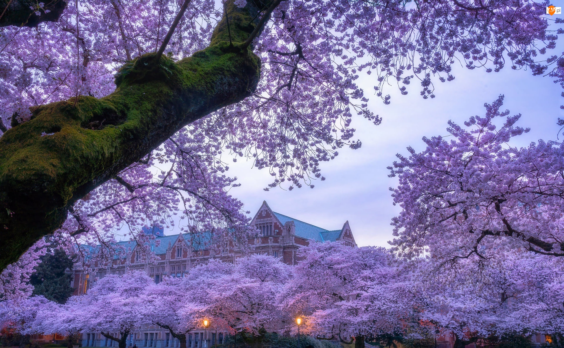 Wiosna, Stan Waszyngton, Gałęzie, Okwiecone, Drzewa, Uniwersytet Quad, Waszyngton, Stany Zjednoczone, Budynek
