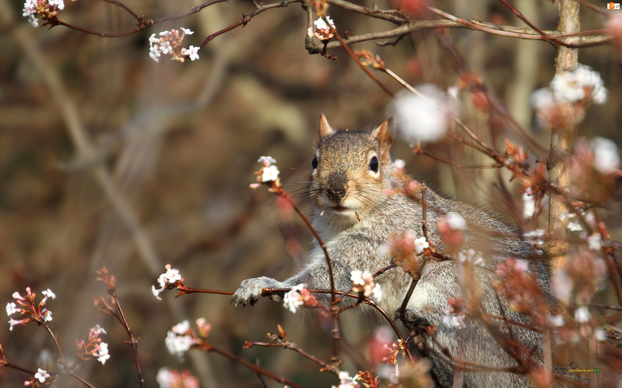 Wiosna, Wiewiórka, Kwitnące, Drzewo