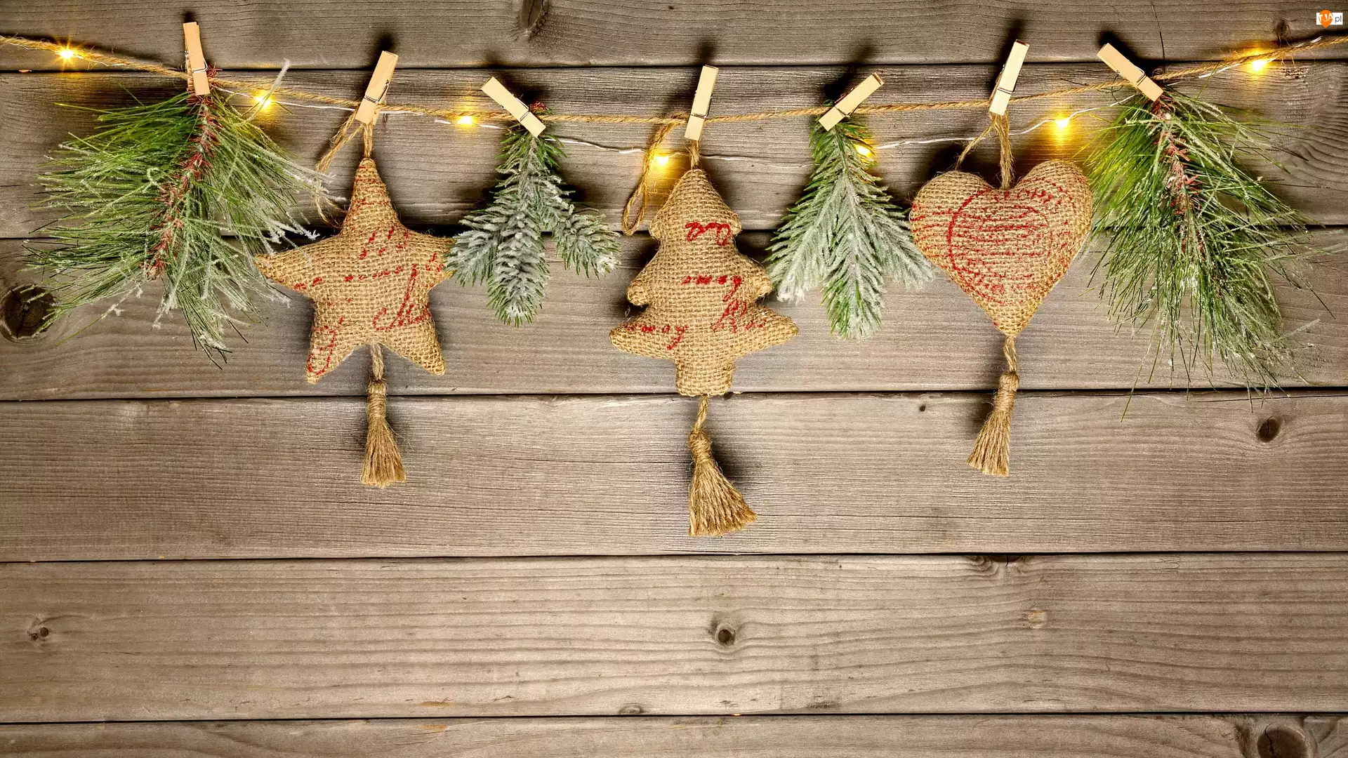 Ozdoby, Choinka, Światełka, Gwiazda, Klamerki, Świąteczne, Serce, Sznurek, Gałązki, Wiszące, Deski