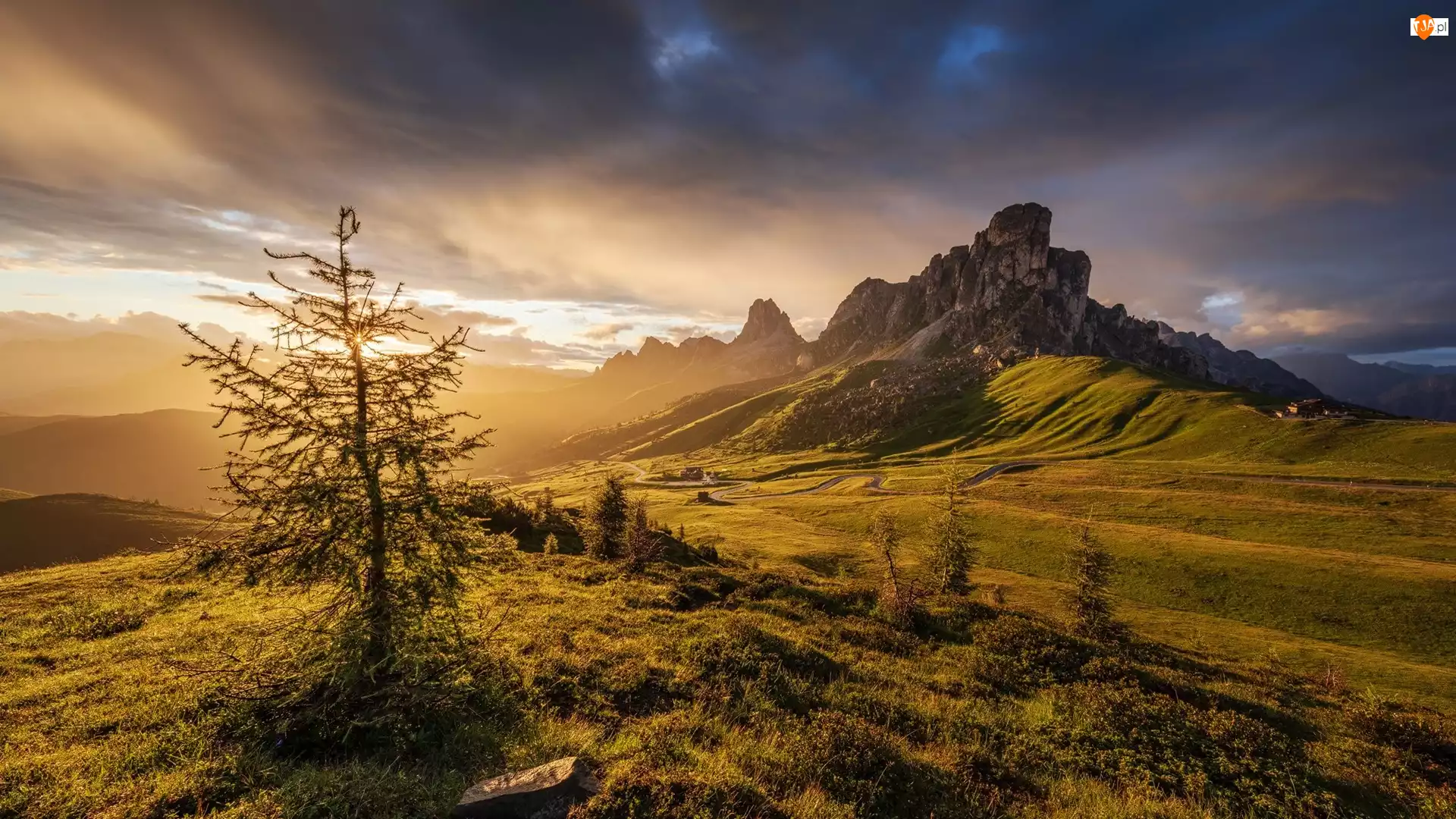 Włochy, Dolomity, Drzewo, Chmury, Droga, Góra Ra Gusela, Przełęcz Giau Pass, Góry, Wschód słońca