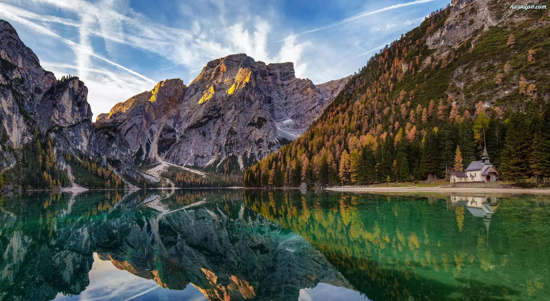 Włochy, Dolomity, Odbicie, Las, Chmury, Jezioro Pragser Wildsee, Kapliczka, Góry, Drzewa