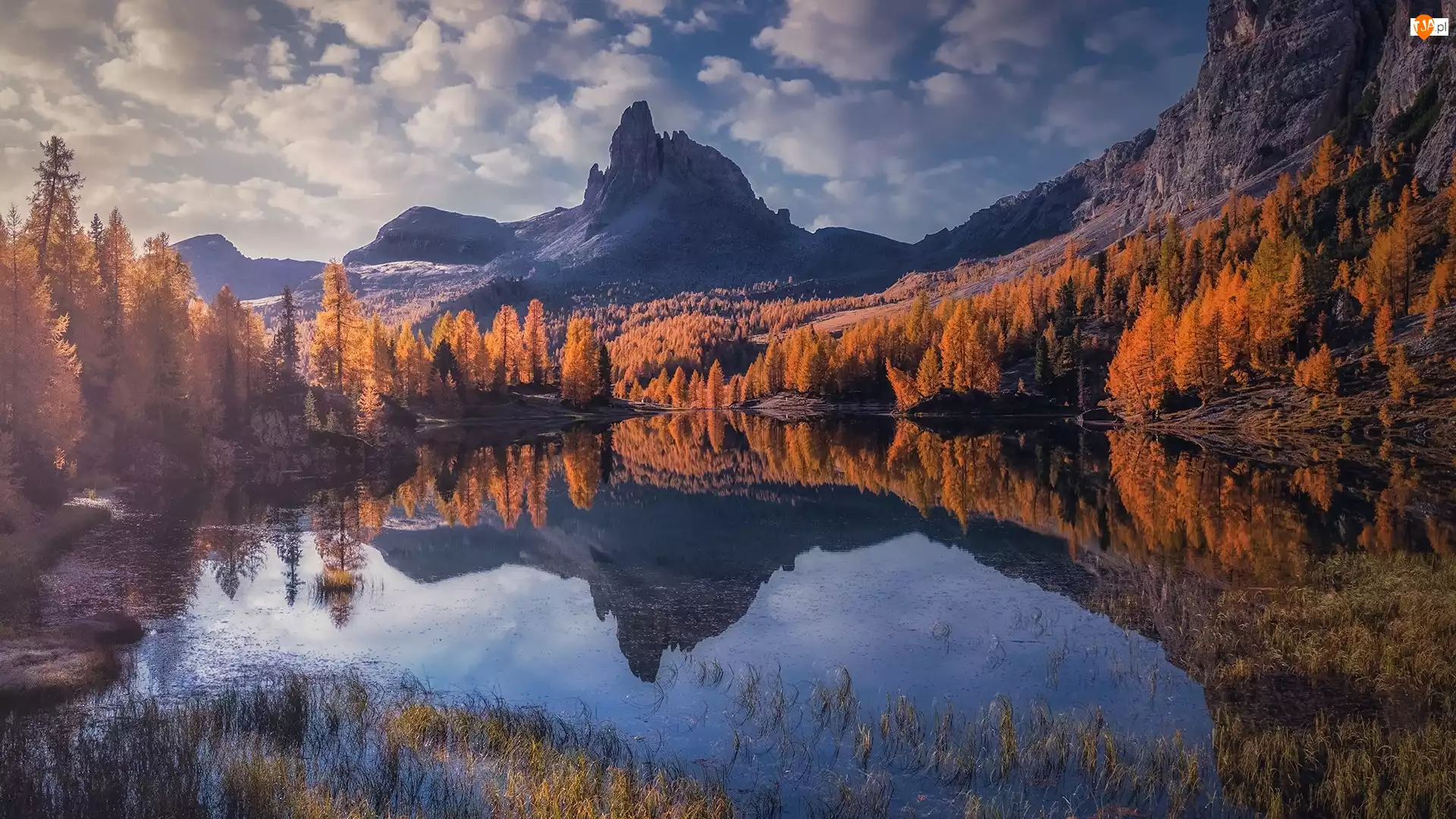 Włochy, Góry, Trawa, Drzewa, Modrzew, Jezioro, Lago Federa, Jesień, Żółte