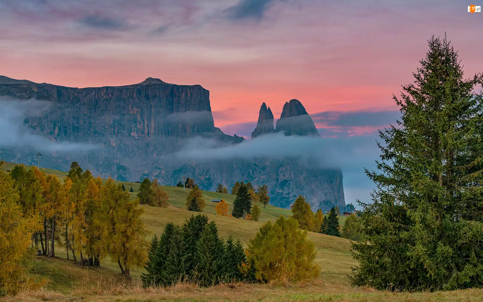 Włochy, Polana, Mgła, Drzewa, Dolomity, Góry, Skały, Góra Schlern, Las, Tyrol