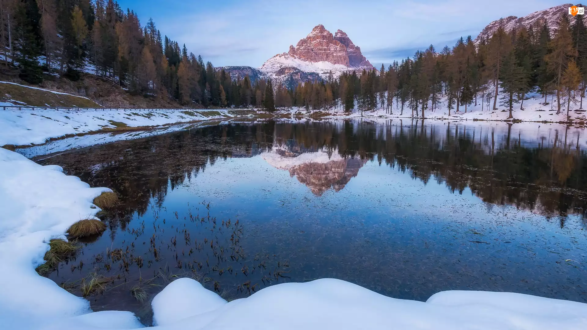 Włochy, Tre Cime di Lavaredo, Drzewa, Masyw, Jezioro, Zima, Góry, Antorno Lake, Dolomity, Prowincja Belluno