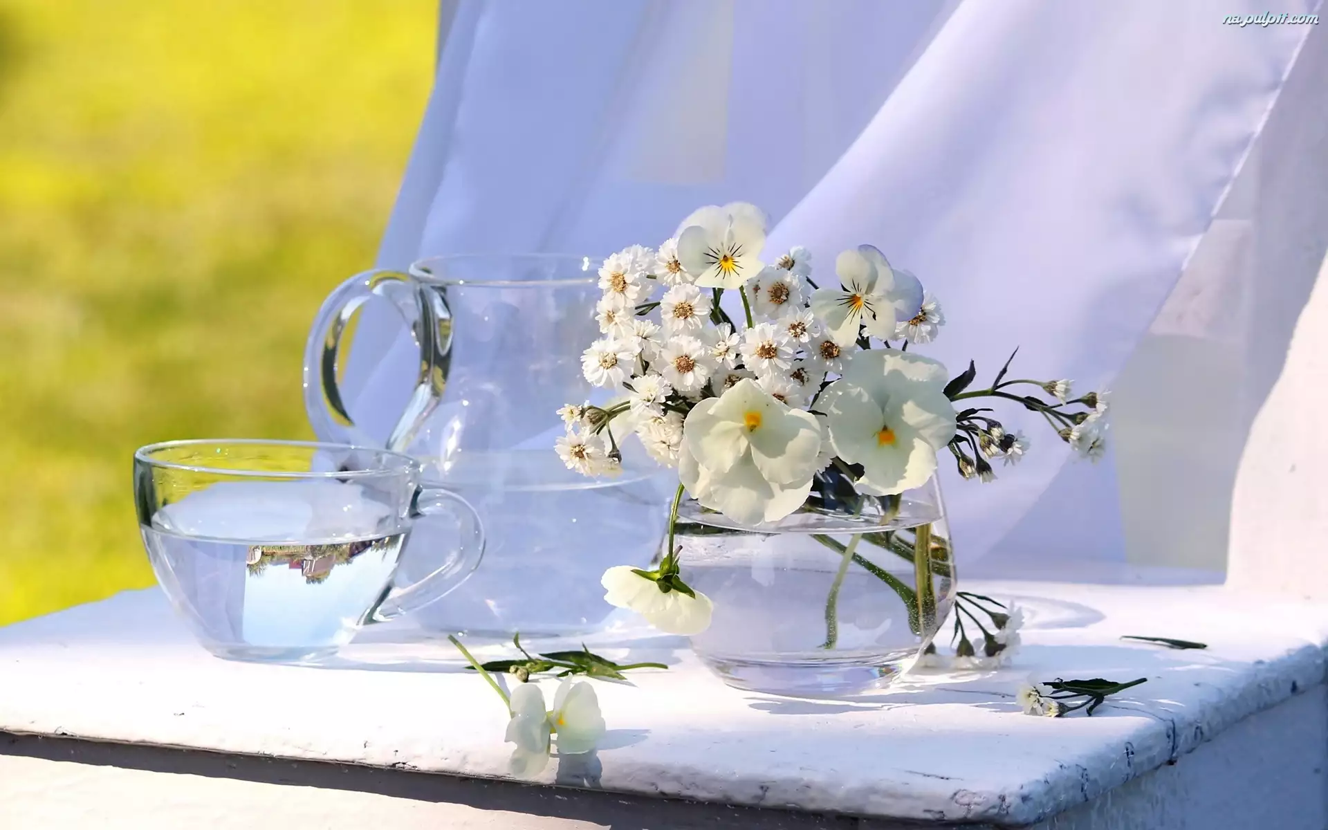 Woda, Białe, Kwiaty, Bratki, Wazonik