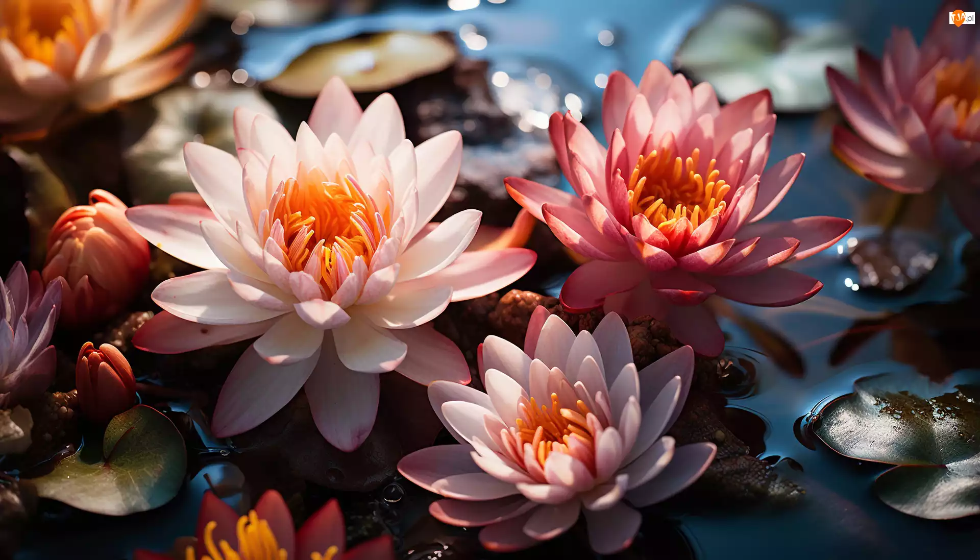 Rozświetlone i rozkwitnięte białe lilie wodne z liśćmi
