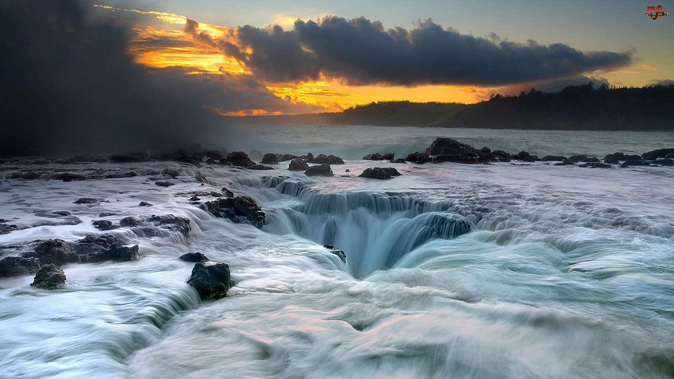 Woda, Skały, Słońca, Zachód, Wodospady