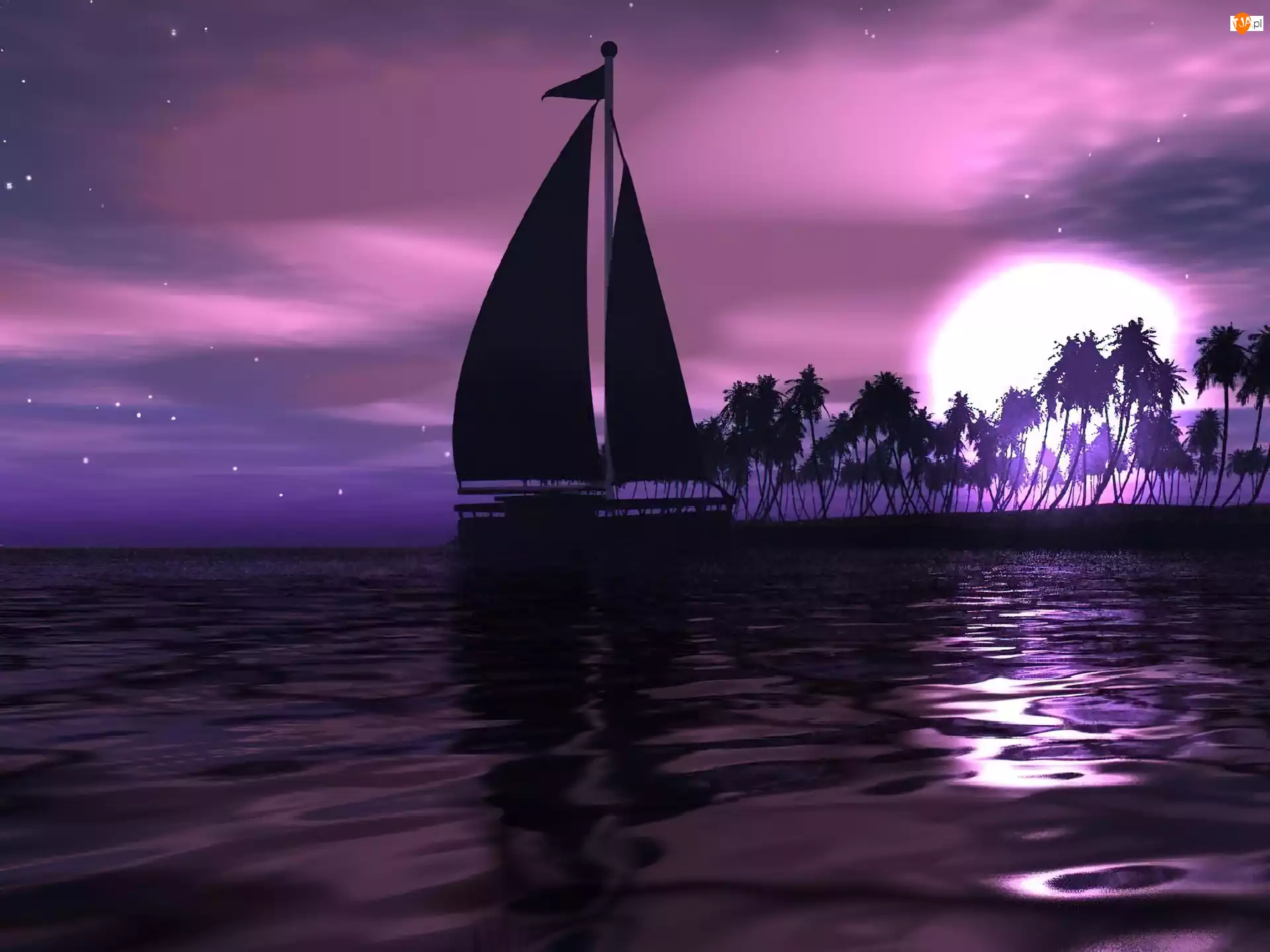 Woda, Żaglówka, Fioletowe, Palmy, Niebo