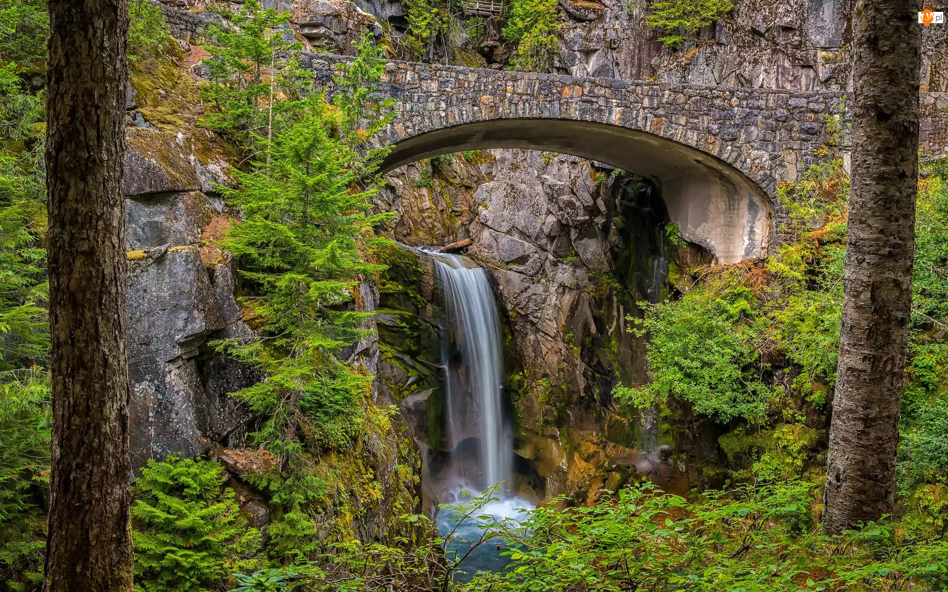 Christine Falls, Waszyngton, Wodospad, Most, Drzewa, Park Narodowy Mount Rainier, Wąwóz, Stany Zjednoczone, Van Trump
