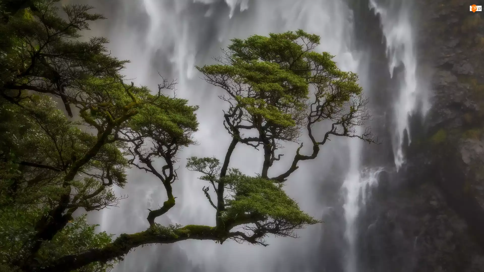 Nowa Zelandia, Wodospad Devils Punch Bowl Falls, Sosny, Park Narodowy Arthurs Pass