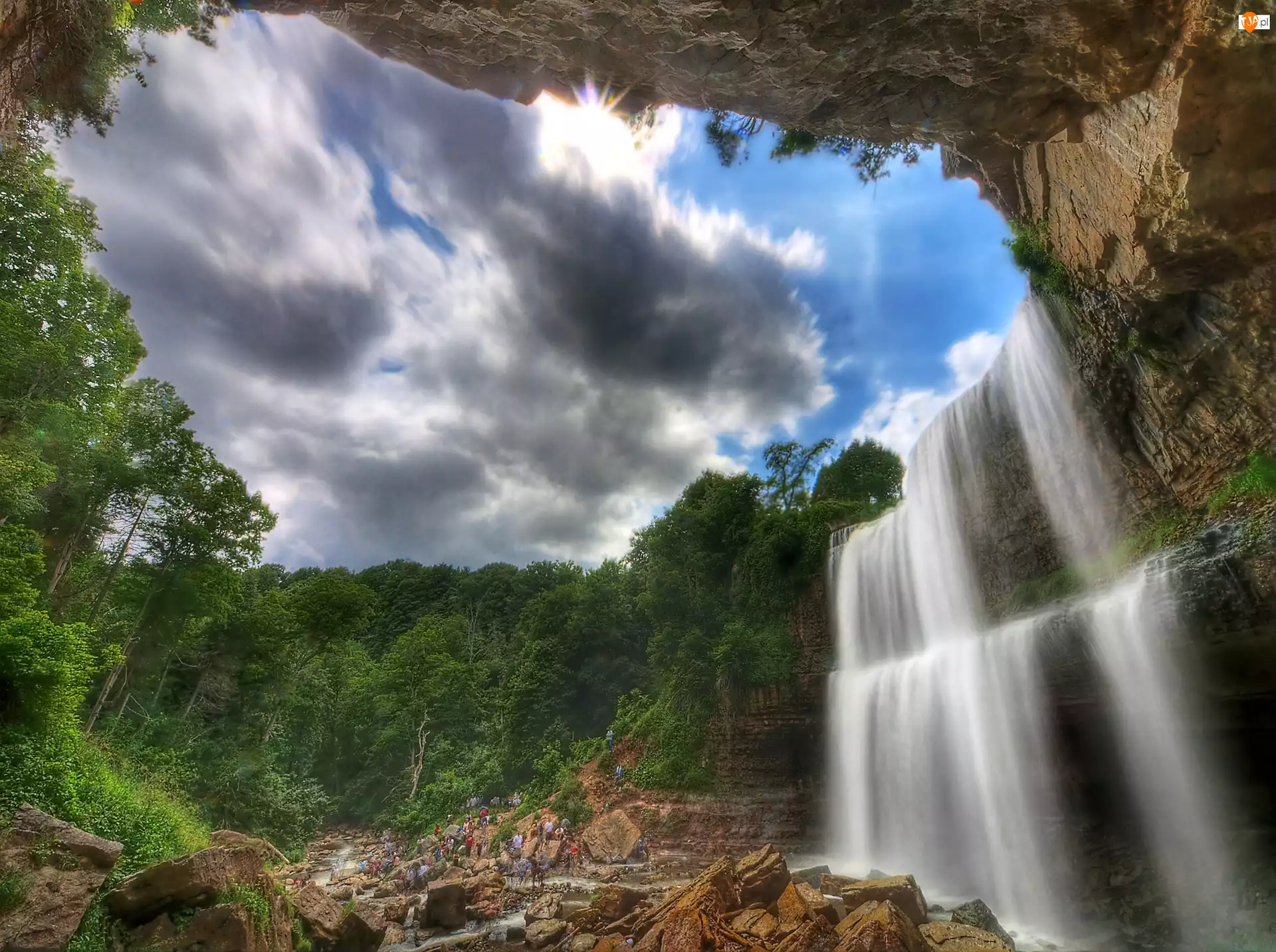 Wodospad, Drzewa, Skały, Chmury