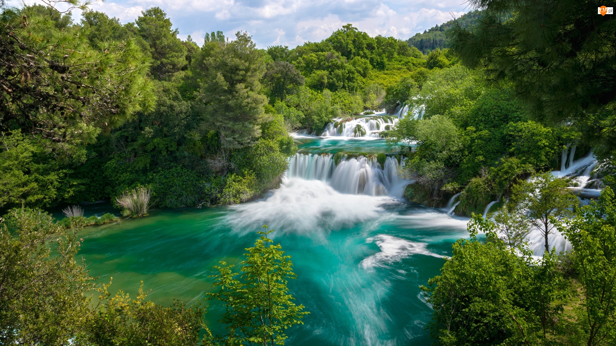 Wodospad, Kaskada, Rzeka Krka, Chorwacja, Drzewa,