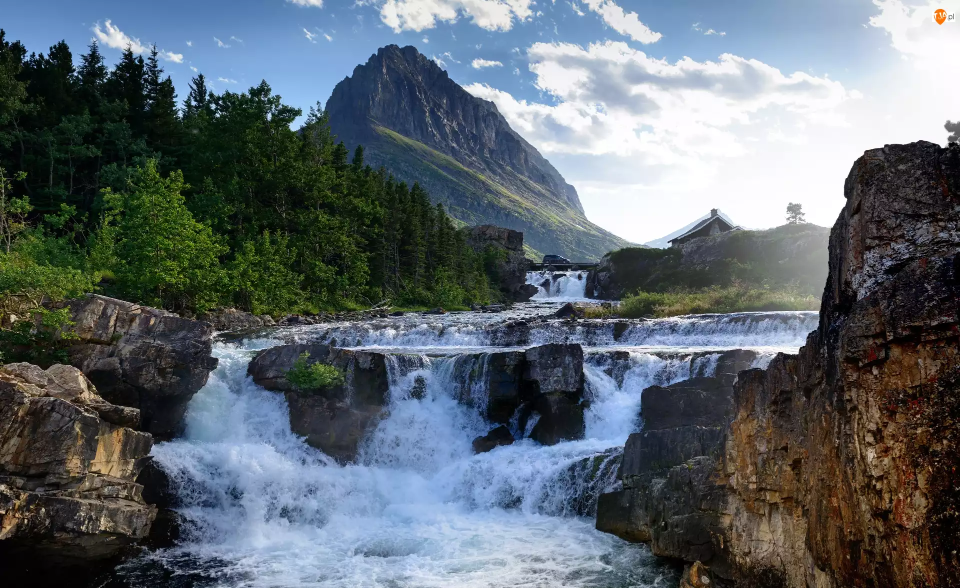 Skały, Góry, Rzeka, Most, Wodospad, Drzewa, Chmury, Kaskada